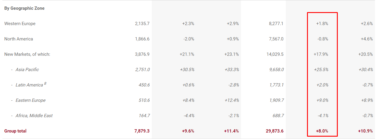 Al analizar su desempeño por regiones fueron los nuevos mercados los que le devolvieron los mejores resultados con un incremento del 17.9%. Y dentro de los mismos Asia Pacífico le representó un 25.5% de crecimiento a lo largo del año. Dentro de este grupo la segunda región de importancia fue Europa del Este que levantó un 9%. Latinoamérica en tanto, le significó un 2% de mejora.