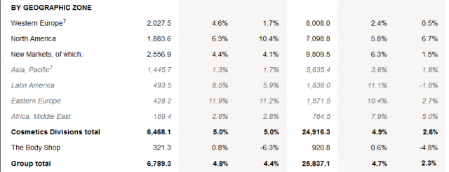 Su unidad de Lujo subió un 6%; la de Cosmética Activa lo hizo un 2.4%; el negocio de masivo ascendió un 1.3% y por último la unidad de Productos Profesionales hizo la plancha con un aumento del 0%.