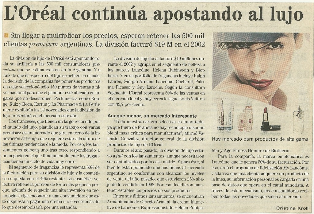 La división de lujo local facturó $19 millones durante el 2002 y agrupa en el segmento de belleza a las marcas Lancôme, Helena Rubinstein y Biotherm. Y en su portfolio de fragancias incluye Ralph Lauren, Giorgio Armani, Lancôme, Cacharel, Paloma Picasso y Guy Laroche. Según la consultora Segmenta, L’oréal representa 50% de las ventas en el mercado laboral y muy cerca le sigue a Louis Vuitton con 32,7 por ciento.