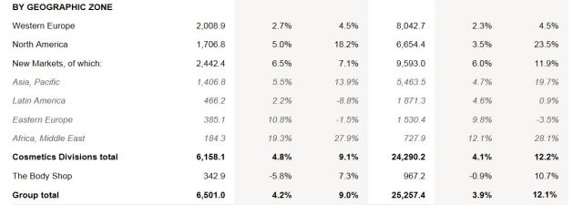 Al mirar las ventas de la compañía por áreas geográficas se vuelve a ver a América Latina como una región en la que la multi tiene una buena respuesta. Africa y Oriente Medio, fue la zona de mejor desempeñó con el 12.1% de crecimiento. En segundo lugar se ubicó la región «nuevos Mercados» con un alza del 6%. Dentro de ella, América Latina ascendió un 4.6%. Aunque mejor les fue en Europa Oriental con un alza del 9.8% y Asia Pacífico que creció un 4.7%
