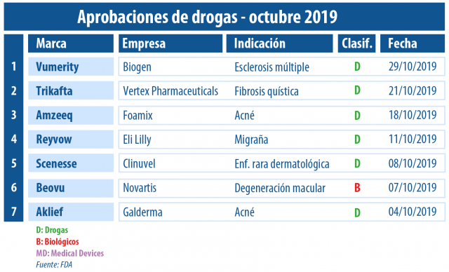 En el décimo mes del año el la agencia norteamericana autorizó tres productos enrolados en el segmento de Dermato. Uno de los avales destacados fue el otorgado a Aklief, una crema de la suiza Galderma que se constituyó como la primera molécula retinoide para el tratamiento del acné en más de 20 años. Ver Artículo.