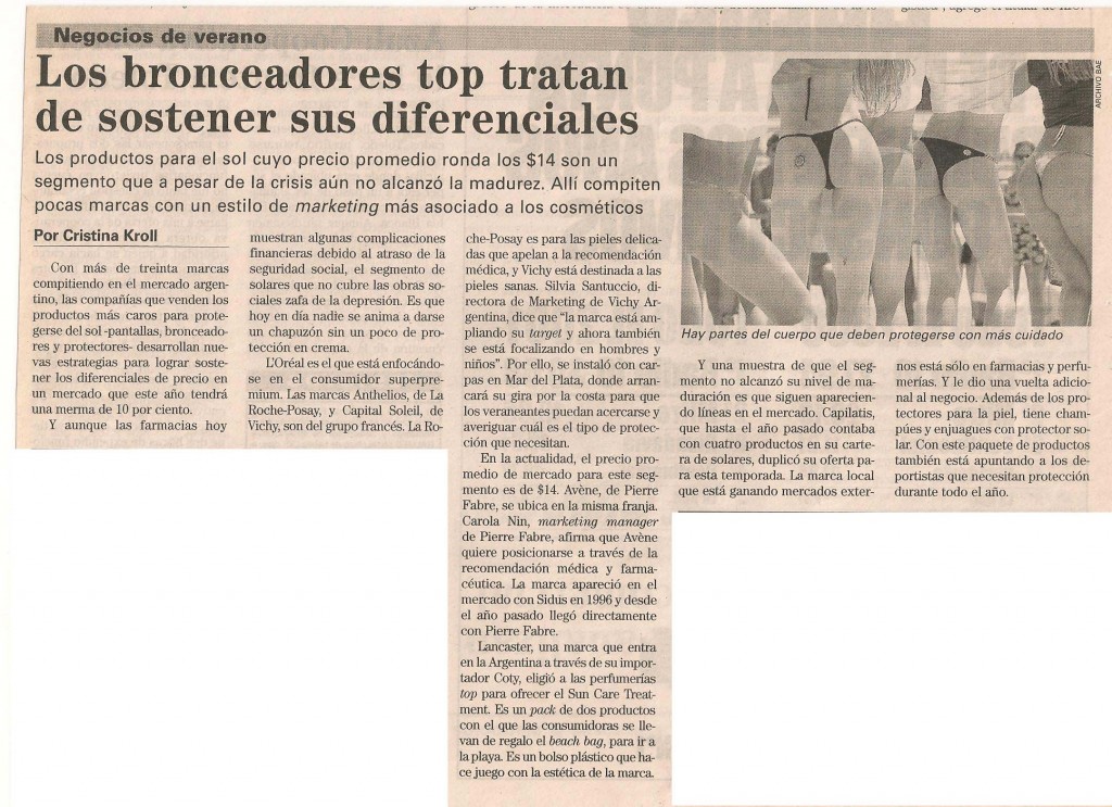 L´Oréal es el que está enfocándose en el consumidor superpremium. Las marcas Anthelios, de La Roche-Posay, y Capital Soleil, de Vichy, son del grupo francés. La Roche-Posay es para las pieles delicadas que apelan a la recomendación médica, y Vichy está destinada a las pieles sanas. Silvia Santuccino, directora de Marketing de Vichy Argentina, dice que “la marca está ampliando su target y ahora también se está focalizando en hombres y niños”. Por ello, se instaló con carpas en Mar del Plata, donde arrancará su gira por la costa para que los veraneantes puedan acercarse y averiguar cuál es el tipo de protección que necesitan.