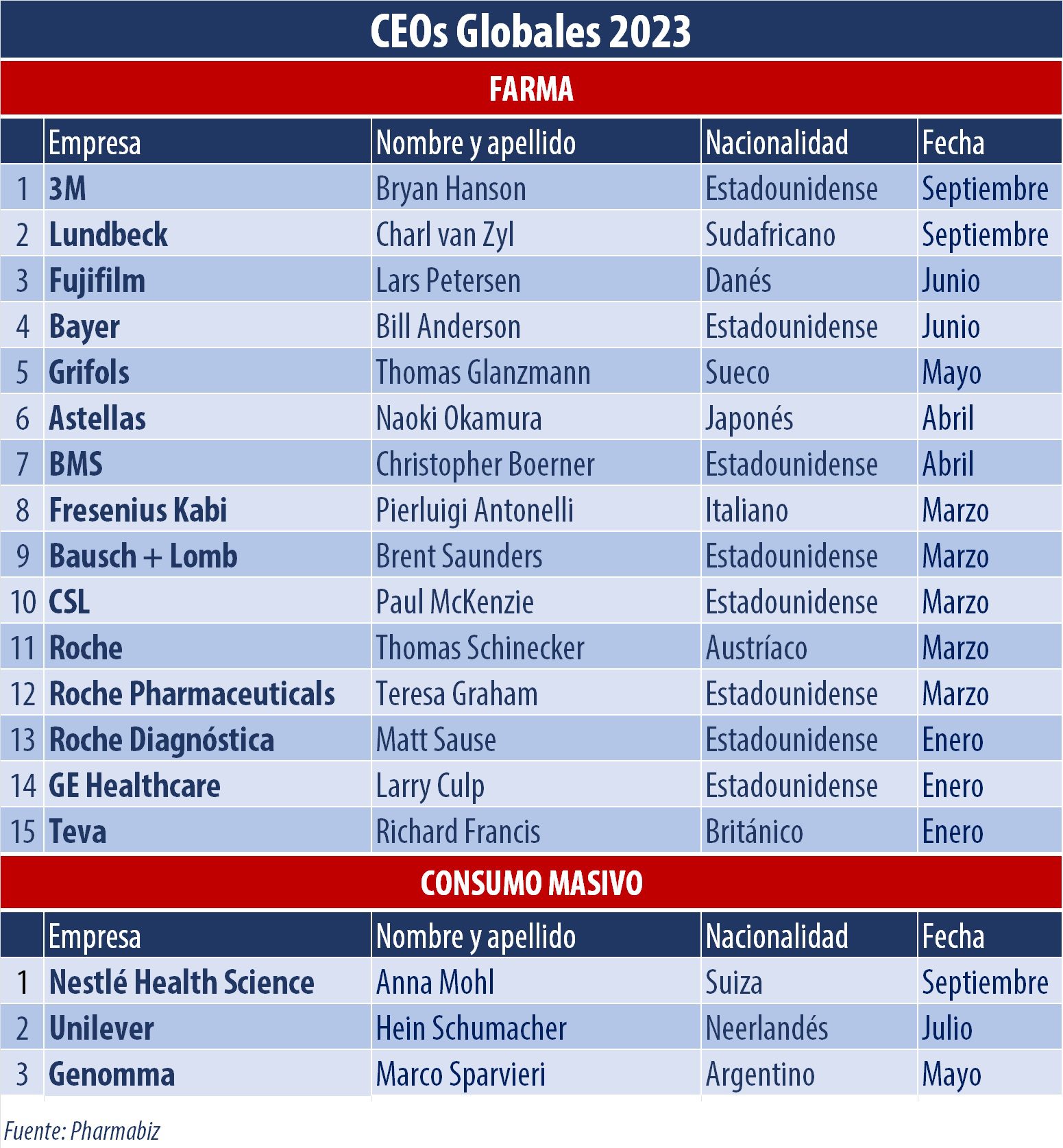 En este 2023 se registraron diversos cambios en las multis de farma y de consumo masivo a nivel global. El fin de la era Baumann tras siete años como CEO de la alemana Bayer posiblemente sea el de mayor impacto informativo. También surgieron dos nuevas cabezas en la suiza Roche y varias compañías redefinieron sus estructuras y enfoques.