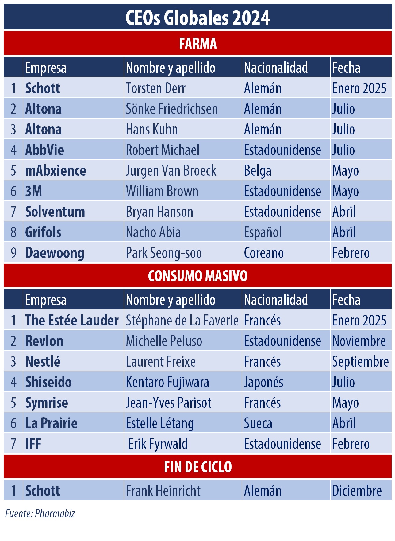 El 2024 concluye con cambios de toda índole en los sillones globales de la industria de farma. Pharmabiz realiza un completo informe propio en el que se detallan los principales nombramientos en el campo de la industria de farma y del consumo masivo.