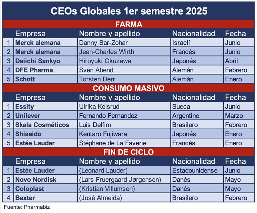 La primera mitad del 2025 registró cambios de toda índole en los sillones globales de farma, consumo y cosmética. Pharmabiz realiza un completo informe propio en el que se detallan los principales nombramientos del semestre.