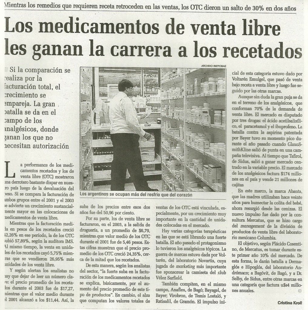La perfomance de los medicamentos recetados y los de venta libre (OTC) mostraron un derrotero bastante dispar en nuestro país luego de la devaluación del peso. Si se comparan la facturación de ambos grupos entre el 2001 y el 2003 se advierte un crecimiento sustancialmente mayor en las colocaciones de medicamentos de venta libre.