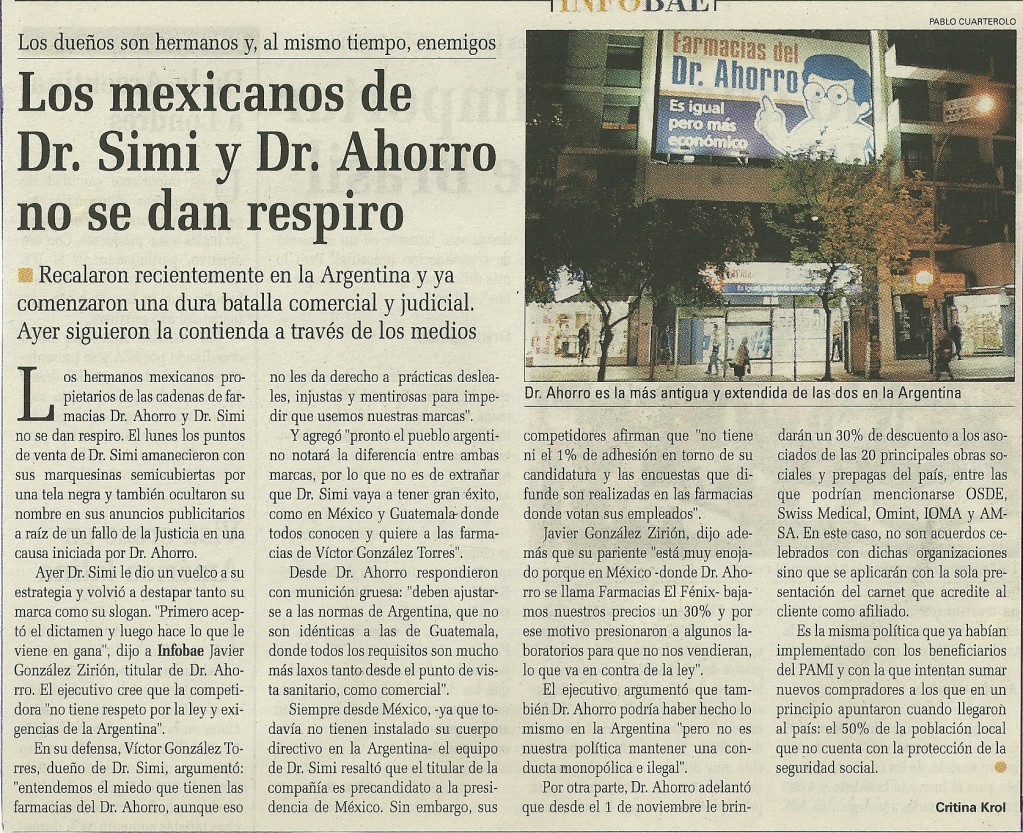 Javier González Zirión, dijo además que su pariente «está muy enojado porque en México -donde Dr. Ahorro se llama Farmacias El Fénix- bajamos nuestros precios un 30% y por ese motivo presionaron a algunos laboratorios para que no nos vendieran, lo que va en contra de la ley«.