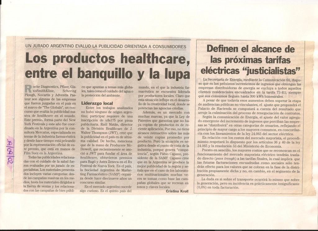 Entre los trabajos analizados no hubo ninguno de origen argentino; participar requiere de una inscripción de u$s175 por pieza publicitaria. Raúl Matán, director de la División Healthcare de J. Walter Thompson -JWT-, cree que la publicidad en el país es de altísima calidad. De hecho, menciona que de la mano de Producere Mc Dowell, que recientemente se asoció a JWT para fundar el área de healthcare, obtuvieron premios para Bagó y Astra Zeneca en el Rx Festival de Nueva York. En el país, la Sociedad Argentina de Marketing Farmacéutico -SAMF- organiza desde hace diecinueve años un concurso similar.