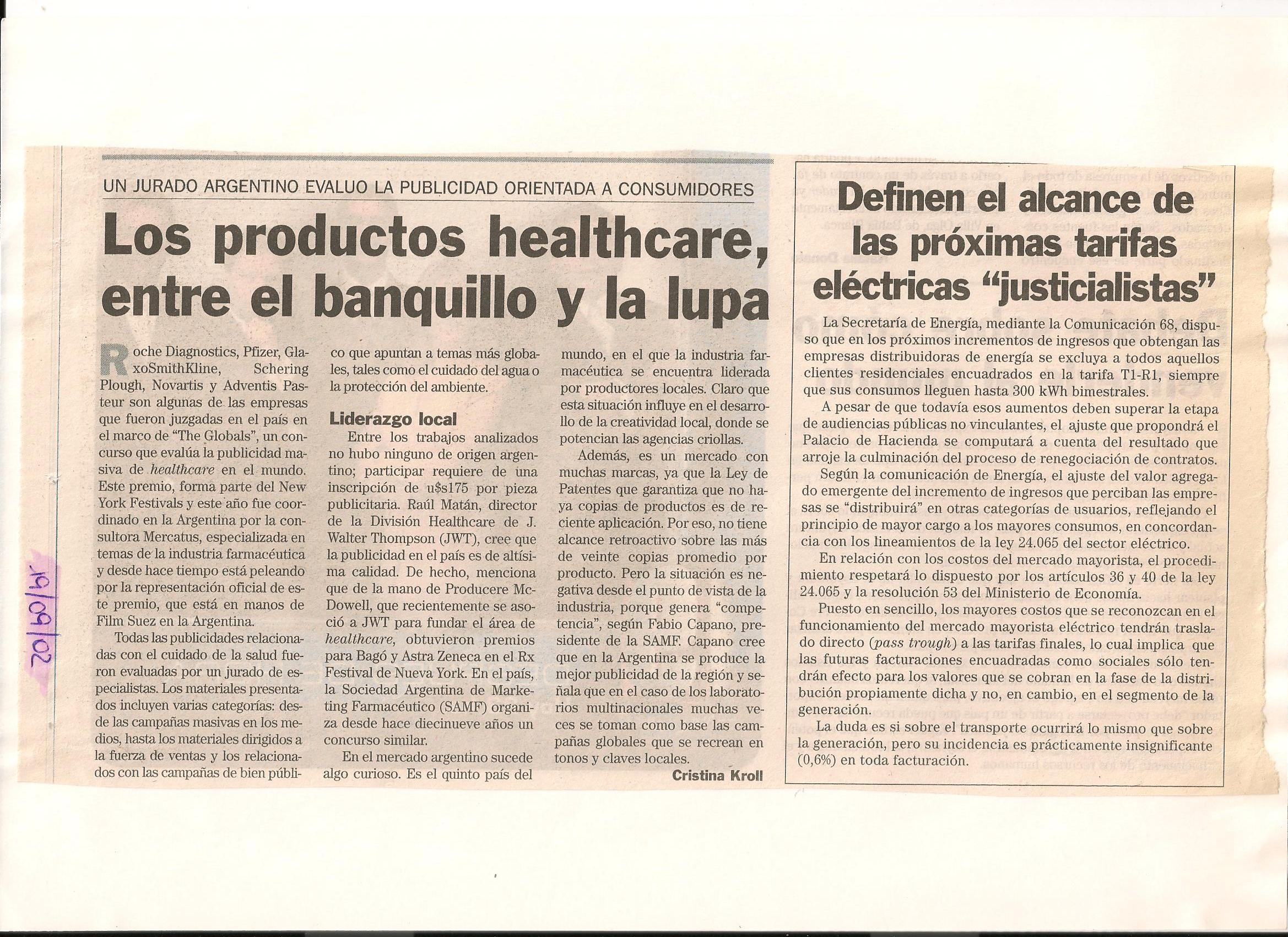 Roche Diagnostics, Pfizer, GlaxoSmithKline, Schering Plough, Novartis y Adventis Pasteur son algunas de las empresas que fueron juzgadas en el país en el marco de “The Globals”, un concurso que evalúa la publicidad masiva de healthcare en el mundo.