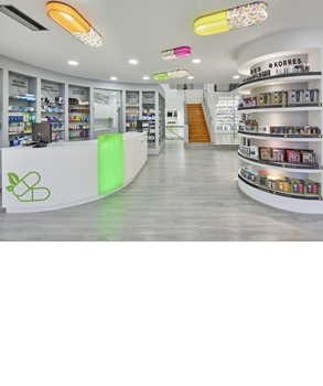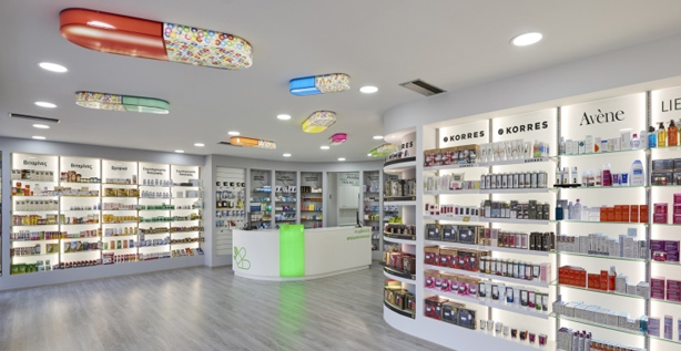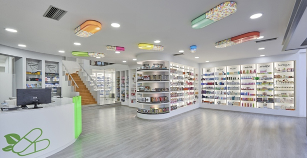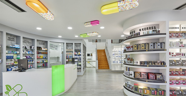 Las coloridas lámparas en formas de píldoras se encuentran adheridas al techo de toda la farmacia, luciendo un diseño original y divertido.