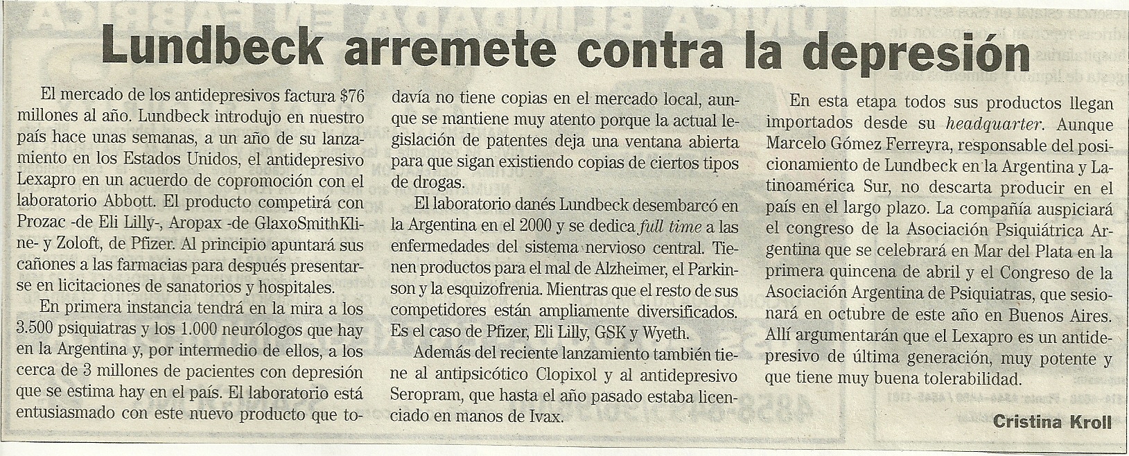 Marcelo Gómez Ferrevra, responsable del posicionamiento de Lundbeck en la Argentina y Latinoamérica Sur, no descarta producir en el país en el largo plazo. La compañía auspiciará el congreso de la Asociación Psiquiátrica Argentina que se celebrará en Mar del Plata en la primera quincena de abril y el Congreso de la Asociación Argentina de Psiquiatras, que sesionará en octubre de este año en Buenos Aires. Allí argumentarán que el Lexapro es un antidepresivo de última generación, muy potente y que tiene muy buena tolerabilidad.