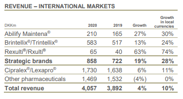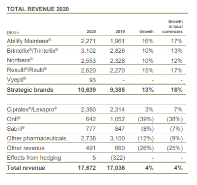 En su informe de resultados, la multi dijo que sus marcas estratégicas Abilify Maintena, Brintellix / Trintellix, Northera, Rexulti / Rxulti y Vyepti crecieron un 13% durante el año pasado a DKK 10.639 millones (u$s 1.721,5 millones), lo que representó el 60% de sus ingresos. Ver Reporte Anual