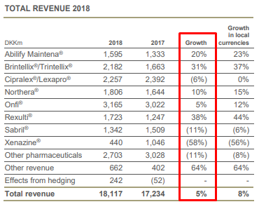 La danesa Lundbeck, enfocada en Sistema Nervioso Central, dijo que sus ventas crecieron un 5% a nivel global durante el 2018. Sus drivers de peso fueron Rexulti y Trintellix, que escalaron un 38% y un 31% respectivamente.