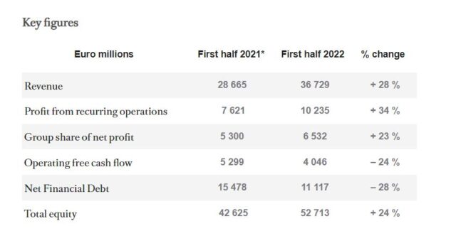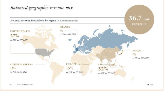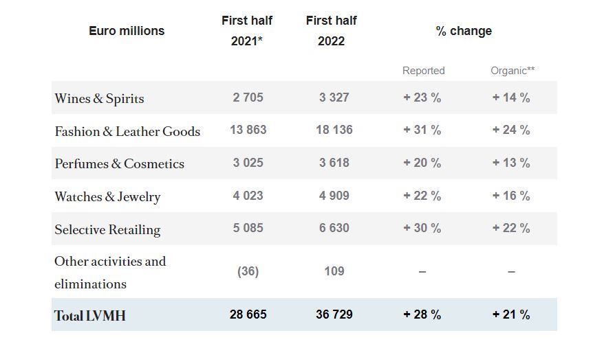 Un robusto crecimiento en Europa, Japón y Estados Unidos le permitió al grupo francés de lujo LVMH entregar a sus accionistas un sólido balance contable. Durante el primer semestre del año, sus ventas medidas de manera orgánica, se dispararon un 28% a €36.729. Fue frente a los €28.665 millones que la compañía facturó en la primera mitad del 2021. Ver press release.