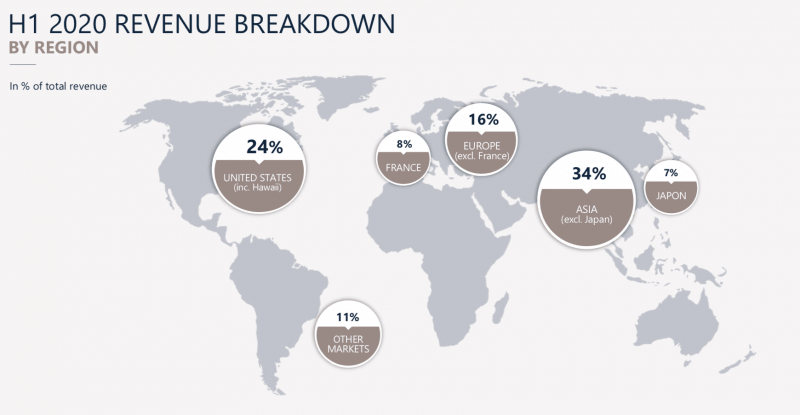 En Perfumes y Cosméticos, los ingresos globales cayeron de € 3.236 millones en los primeros seis meses de 2019 a los actuales € 2.304 millones. El 49% de esta facturación se originó en la región de Asia, excluyendo Japón. Europa, sin contar el mercado galo, aportó el 16%, mientras que EE.UU representó el 12% de los ingresos. La región denominada «Otros Mercados», que incluye América Latina, fue la responsable del 10% de las ventas de esta unidad de negocios, en tanto Francia y Japón tuvieron un peso del 8% y del 5% respectivamente.