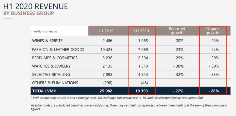 Los ingresos de la francesa LVMH, dueña de las fragancias Christian Dior, J’adore, Givenchy y Kenzo, se desplomaron un 27% durante el primer semestre del año a € 18.393 millones, frente a los € 25.082 millones que facturó en la primera mitad de 2019. Ver press release.