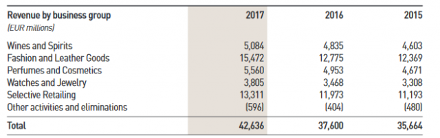 La francesa LVMH, experta en el negocio de fragancias, difundió sus resultados financieros correspondientes al 2017. Así, mostró que su negocio de moda quedó al frente con una facturación de €15.472 millones; segundo se ubicó el retail selectivo con ventas por €13.311 millones y en tercer lugar su negocio de Perfumes y cosméticos, el que le significó €5.560 millones. Ver Informe.