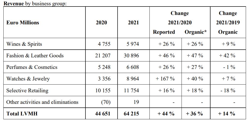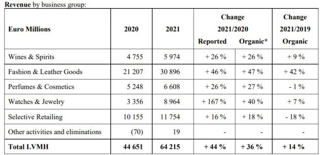 La compañía francesa LVMH, dueña de fragancias como Givenchy; Christian Dior; J’adore; y Kenzo, publicó sus resultados financieros correspondientes al 2021. Según el reporte los ingresos medidos de manera orgánica aumentaron un 36%, con una facturación de € 64.215 millones.