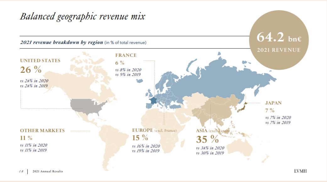 En términos geográficos, el 35% de la facturación de LVMH se originó en Asia y un 26% en Estados Unidos. Por otra parte, Europa aportó un 15% y Otros Mercados, entre los que se encuentra América Latina, un 11%. Por último, Japón y Francia, contribuyeron con un 7% y 6% respectivamente.