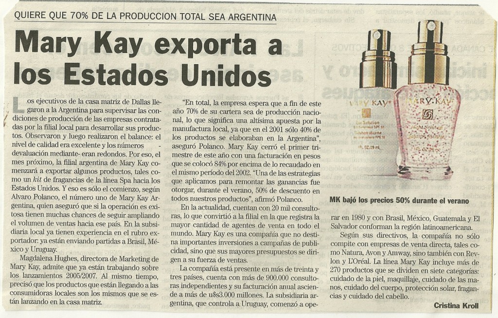 Los ejecutivos de la casa matriz de Dallas llegaron a la Argentina para surpervisar las condiciones de producción de las empresas contratadas por la filial local para desarrollar sus productos. Observaron y luego realizaron el balance: el nivel de calidad era excelente y los números devaluación mediante- eran redondos. Por eso, el mes próximo, la filial argentina de Mary Kay comenzará a exportar algunos productos, tales como un kit de fragancias de la línea Spa hacia los Estados Unidos. Y eso es sólo el comienzo, según Alvaro Polanco, el número uno de Mary Kay Argentina, quien aseguró que si la operación es exitosa tienen muchas chances de seguir ampliando el volumen de ventas hacía ese país. En la subsidiaria local ya tienen experiencia en el rubro exportador: ya están enviando partidas a Brasil, México y Uruguay.