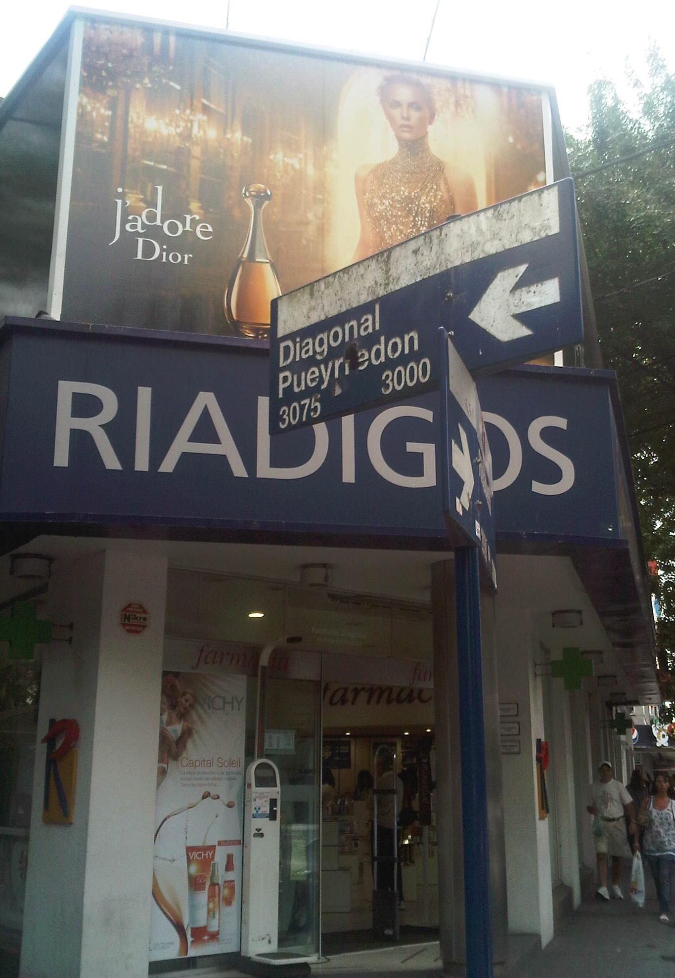 Farmacia Riádigos, sucursal Diagonal Pueyrredón. Vista de noche, Farmacia Riádigos de la calle Güemes.