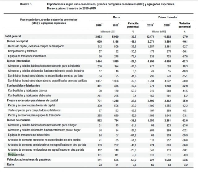 Las importaciones de farma, en tanto, declinaron -0.3% durante el primer trimestre del año, mientras que en la comparativa con marzo del 2018 las mismas se derrumbaron un -9%.