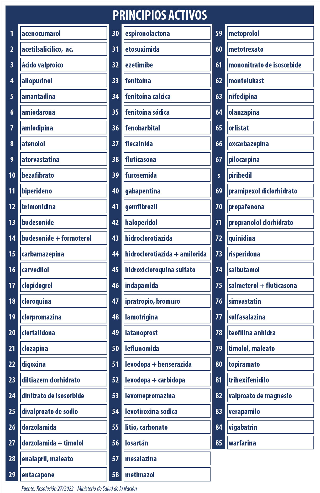 El Ministerio de Salud de la Nación dio a conocer un listado de 85 principios activos para los que se establecerán precios de referencia. Ver Boletín Oficial