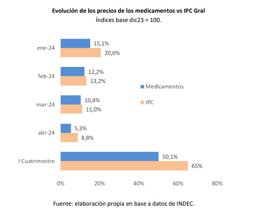 A su vez, se detalló que en el acumulado cuatrimestral los precios de los medicamentos variaron un 50,1%, mientras el aumento del IPC para el mismo período fue de 65%. De esta manera, la suba de estos productos se ubicó 14,9 puntos porcentuales por debajo de la inflación.