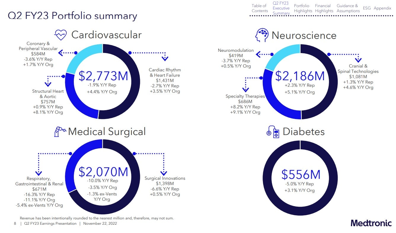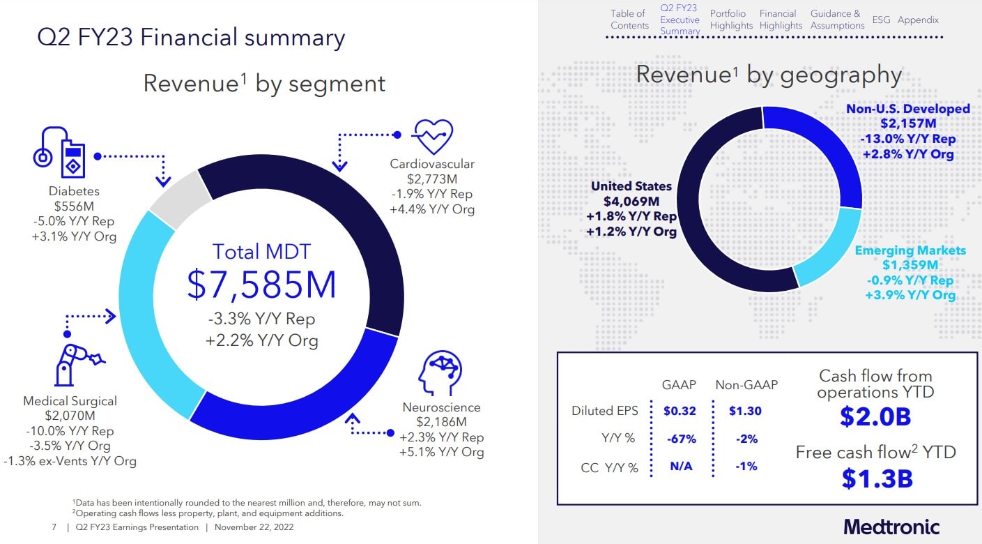 Medtronic publicó su reporte de resultados correspondiente al primer semestre del año fiscal 2023. Según el documento, la compañía de medical devices cayó un -5,6%, por un total de u$s 14.955 millones. Ver Press Release