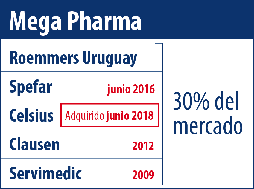 A partir de esta transacción, Celsius -que fue fundada en 1936 y cuya gerencia general está a cargo de Bettina Correa Rivero– se sumó así a las otras empresas que están bajo el paraguas de Mega Pharma. En conjunto alcanzarían cerca del 30% del mercado uruguayo medido en valores, según información relevada por Pharmabiz. Ver infografía.