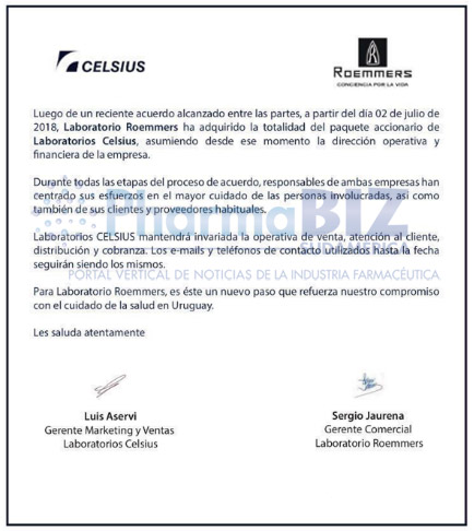 Se trata de la firma uruguaya Celsius, la que quedará bajo el ala de Roemmers Uruguay, tal como se llama la empresa de la que la familia Roemmers se corrió hace pocos meses. Según pudo saber este medio, la compra le implicó a Mega Pharma un desembolso cercano a los u$s 66 millones. Ver documento oficial.