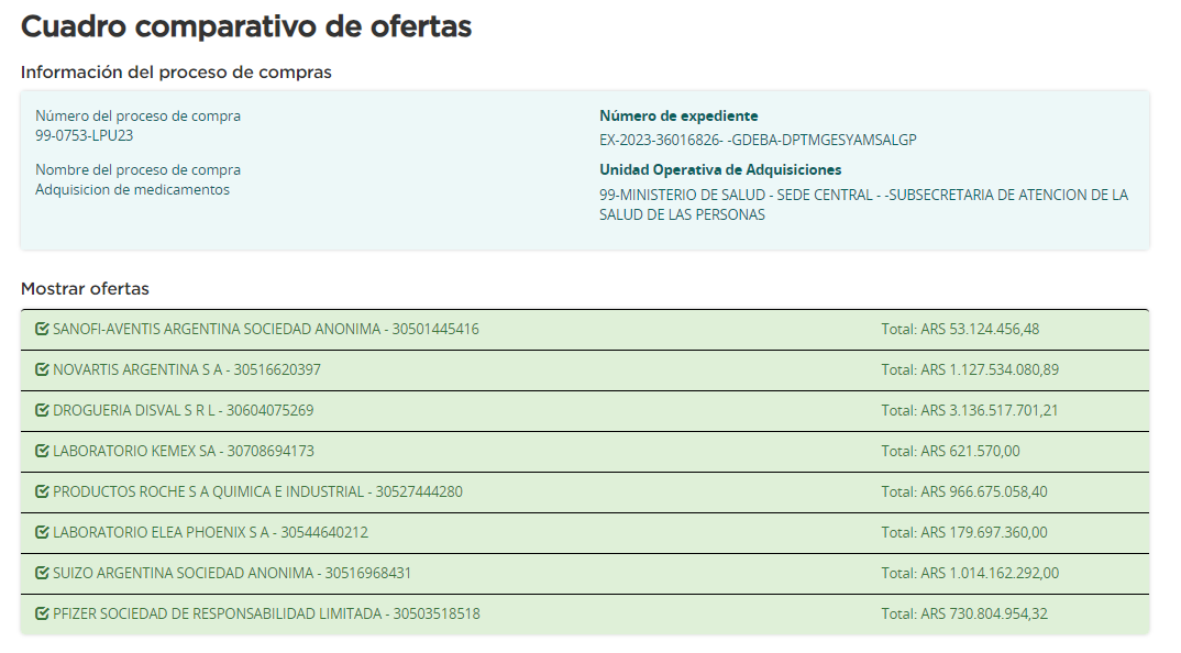A su vez, la francesa Sanofi ofertó en dos renglones por un total de $53.1 millones (u$s 141.5 mil); y la local Kemex levantó la mano por $621.6 mil (u$s 1.7 mil) para un solo renglón.