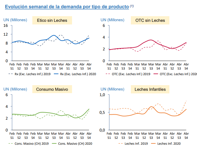 El gran dato de esta pandemia es, sin embargo, que no solo se precipitó el mercado de fórmulas regulares sino también el de las fórmulas medicamentosas, las que tuvieron una abrupta caída del -28.6% entre abril del 2019 y abril del 2020. Esto a pesar de que se trata de una categoría prescriptiva, en la que las presentaciones son indicadas para tratar diferentes patologías.