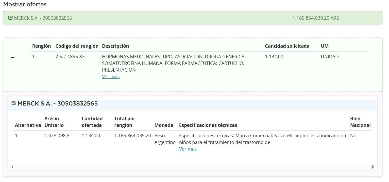La Merck alemana también participa de una licitación pública en curso por 51 mil unidades de este mismo producto, en un proceso que abrió en mayo de este año. Allí se presentó mediante una oferta que alcanza los $1.456 mil millones (u$s 1.6 M*), equivalentes a $28.558,30 (u$s 30,59*) por unidad. El otro oferente fue el laboratorio Gemabiotech, a través de la distribuidora Suizo Argentina, con una cotización de $1.375 mil millones (u$s 1.5M*) y un precio unitario de $26.978 (u$s 28,90*) para su producto Somactive LF. Ver nota apertura