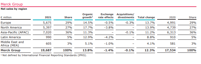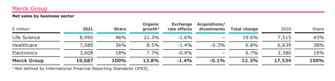 El negocio de Life Science fue el que más trepó en este período, con ventas por € 8.990 millones y una variación del 19,6%. Por su parte, el portfolio de Healthcare exhibió un alza del 6,8%, ya que alcanzó los € 7.089 millones en el 2021. Aquí se destacó la buena performance de productos como Mavenclad, para esclerosis múltiple; y Bavencio, para carcinoma avanzado de células renales. Ver presentación.
