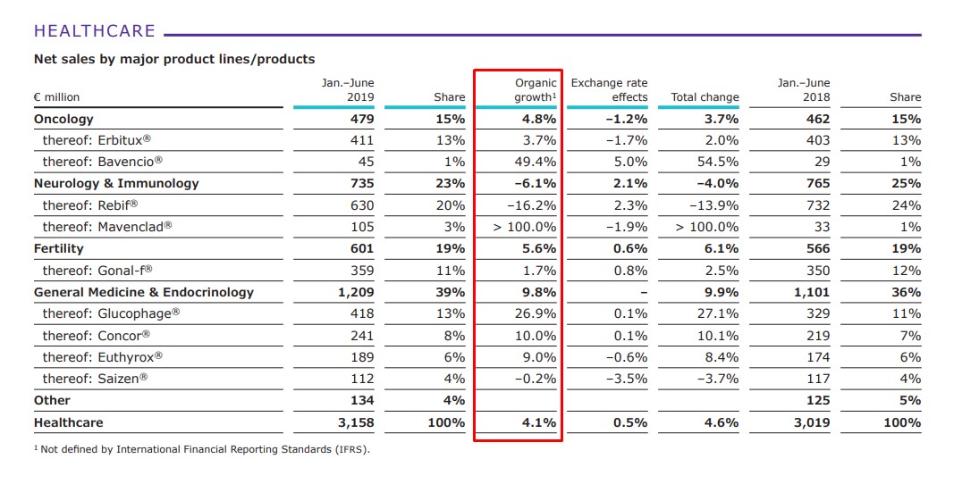 Dentro de Healthcare el producto que marcó la diferencia fue Mavenclad, para esclerosis múltiple, que trepó más del 100% frente a la primera mitad del 2018. Aunque su actuación se vio contrarrestada por la de Rebif, para la misma indicación, que declinó un -16.2%, lo que generó una caída del -6.1% en el segmento de Neuro e Inmuno.