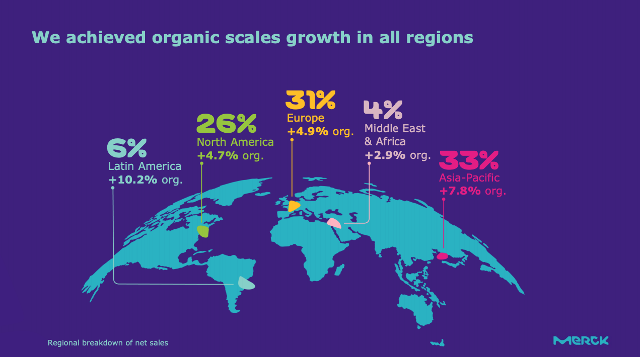 En cuanto a la performance por regiones, Merck detalló que Asia Pacífico representó el 33% de los ingresos de la corporación, y creció un 7.8%; Europa por su parte le otorgó el 31% de la facturación y ascendió un 4.9%; y Norteamérica le significó el 26%, con un alza del 4.7%. En tanto, Latinoamérica le entregó el 6% de las ventas y fue la que más creció con un alza del 10.2%; mientras que la zona conformada por Medio Este y África subió un 2.9% y le devolvió el 4% de los ingresos.