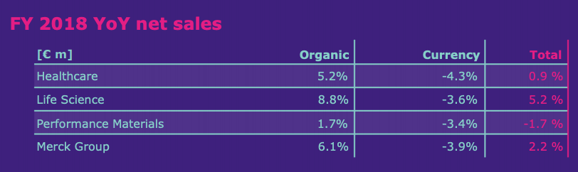 La alemana Merck anunció hoy, jueves 7 de marzo, sus resultados financieros del 2018. La multi dijo que alcanzó ventas por € 14.8 millones, lo que significó un incremento orgánico del 6.1% respecto del año anterior. Ver informe anual.