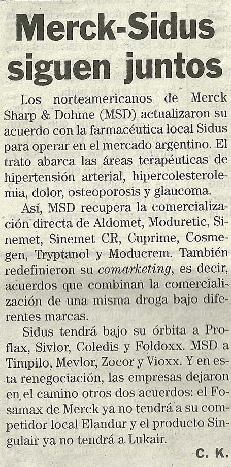 Sidus tendrá bajo su órbita a Proflax, Sivlor, Coledis y Foldoxx. MSD a Timpilo, Mevlor, Zocor y Vioxx. Y en esta renegociación, las empresas dejaron en el camino otros dos acuerdos: el Fosamax de Merck ya no tendrá a su competidor local Elandur y el producto Singulair ya no tendrá a Lukair.