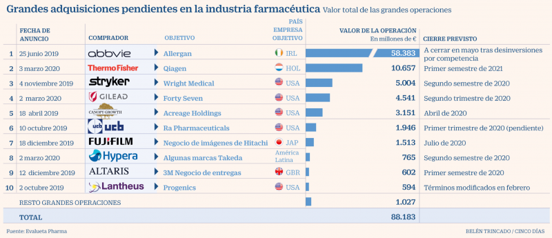 Entre las operaciones listadas, que según Evaluate Pharma suman en conjunto € 90.000 millones, la mayor transacción es la compra de la irlandesa Allergan por parte de la norteamericana Abbvie por alrededor de € 58.000 millones. La misma estaba previsto que se cierre en mayo, luego de la venta de algunos activos por petición de las autoridades regulatorias.
