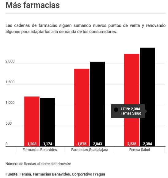 El sector minorista de farmacias en México continúa creciendo y ganando más competidores. A marzo del 2019 las tres cadenas de mayor envergadura que operan en ese país son FEMSA; Farmacias Guadalajara; y Farmacias Benavides.