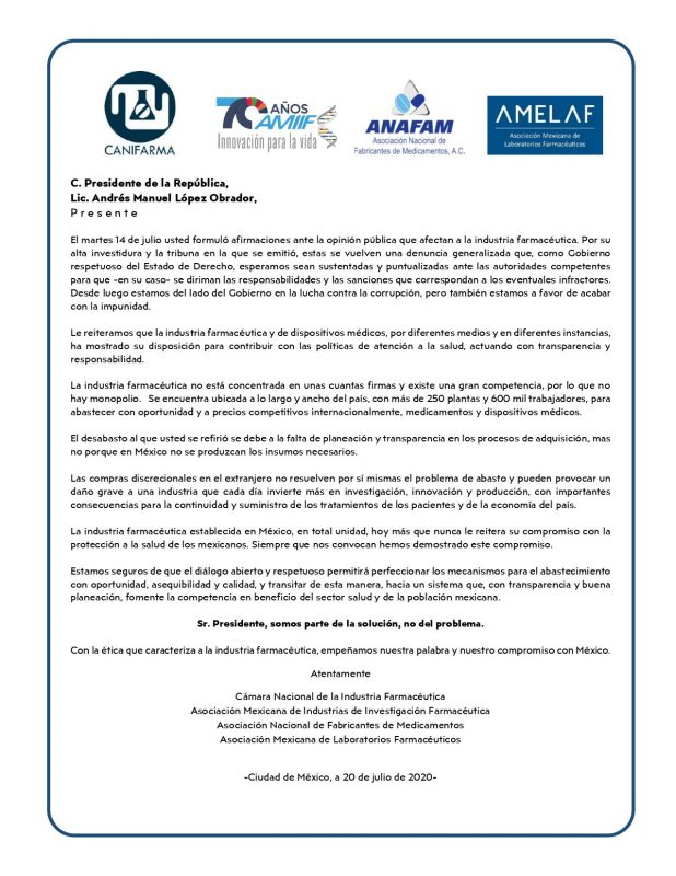 Como respuesta, la Cámara Nacional de la Industria Farmacéutica de ese país –CANIFARMA– emitió un comunicado en el que cuestionó la compra en el extranjero. El mismo lleva las firmas además de la Asociación Mexicana de Industrias de Investigación Farmacéutica –AMIIF-; de la Asociación Nacional de Fabricantes de Medicamentos –ANAFAM-; y de la Asociación Mexicana de Laboratorios Farmacéuticos –AMELAF-. Ver comunicado.