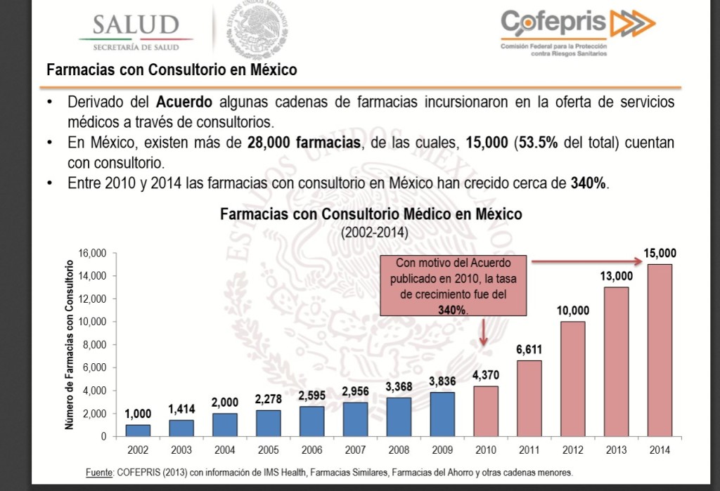 Las cifras hablan por sí solas. En el año 2004 había 2000 consultorios en el ámbito de las farmacias y el 2014 -es decir una década después- cerró con 15.000 puntos de venta. En definitiva, casi la mitad de las farmacias aztecas cuentan con este servicio, ya que según los datos del propio gobierno mexicano hay un total de 28.000 puntos de venta farmacéuticos en dicho país.