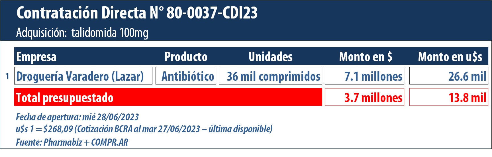 La droguería Varadero está en carrera a fin de proveer al Estado diferentes partidas de Talidomida Lazar. Se trata de un antibiótico indicado para el tratamiento de enfermedades de transmisión sexual, como el HIV, la sífilis, la gonorrea, las hepatitis virales y tuberculosis.