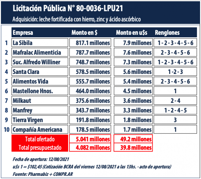 De acuerdo al desglose realizado por el equipo de analistas de Pharmabiz, la decena de compañías que se presentaron en la compulsa lo hicieron mediante ofertas parciales. La principal cotizante fue la entrerriana La Sibila, que se anotó con su marca Purísima en todos lo renglones por un total de $817.1 millones (u$s 7.9 millones).