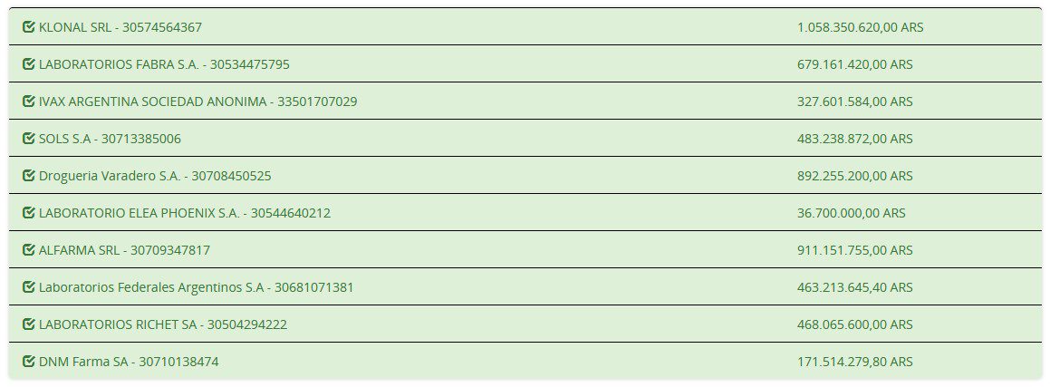 Entre las empresas restantes se encuentra el nacional Fabra, que pide $679.16 millones (u$s 685.1 mil); Sols, propiedad de Luis Knorr, por $483.23 millones (u$s 487.4 mil); y el nacional Richet, de la familia Tavosnanska, con una facturación por $468.06 millones (u$s 472 mil). También figuran los nacionales de Lafedar; Ivax; DNM Farma; y Elea.