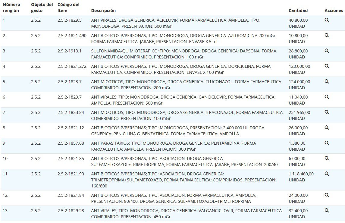El proceso fue solicitado por la Dirección de respuesta al HIV, ITS, Hepatitis Virales y Tuberculosis, y está conformado por 13 renglones. Estos incluyen tres antivirales; dos antibióticos; un antimicótico; un antiparasitario; un antimicrobiano; tres presentaciones de un quimioterápico con bactericida; y un quimioterápico a base de dapsona, el único renglón para el cual no se recibieron ofertas. Ver Contratación