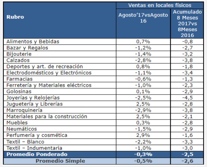 Las transacciones en locales físicos cayeron un -0,3% con respecto al mismo mes del año anterior. Y al momento, ya acumulan una baja anual de -2,5% para los primeros ocho meses del 2017. Ver documento.