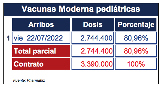 Argentina recibió las primeras 2.7 millones de dosis pediátricas de Moderna para vacunar contra COVID-19 a la población desde los 6 meses hasta los 5 años de edad. El arribo se da luego de que la vacuna reciba su recomendación de uso por parte de la ANMAT.