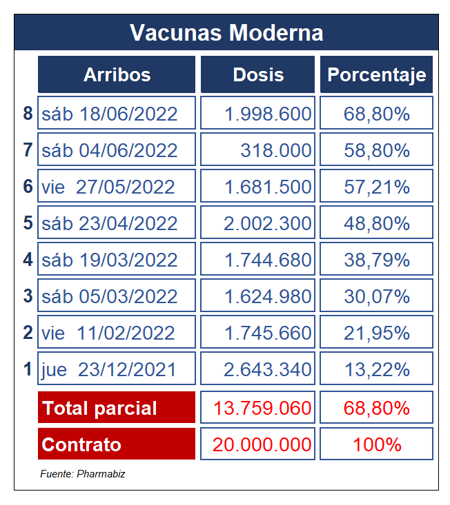 En el caso de Moderna, son 13.7 millones de unidades, a las que hay que adicionarle 3.5 millones de unidades que habían sido descargadas en julio pasado vía donación del Gobierno estadounidense encabezado por Joe Biden.